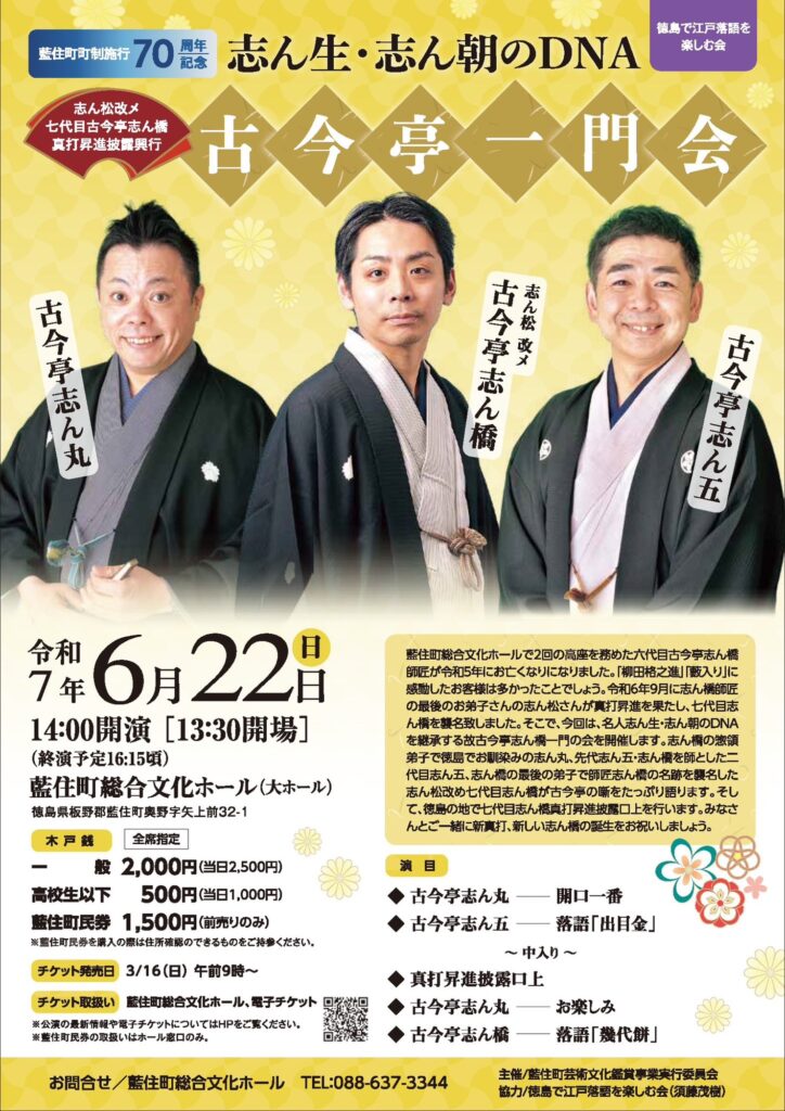 先日徳島に行って参りました!落語会のタイトルが「志ん朝・志ん生のDNA 古今亭一門会」タイトル負けしそう。志ん五兄さんにいたってはネタ出し「出目金」という新作。果たして我々に古今亭のDNAは残っているのだろうかという疑問がありましたが、200名という大勢のお客様がおいでくださいました。