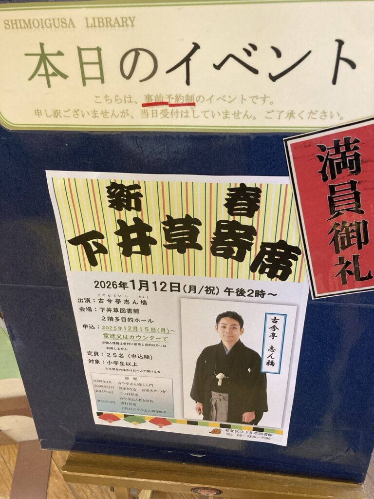 本日は下井草図書館での新春落語会でした。ご来場のお客様ありがとうございました。私は杉並区民ですから、徒歩圏内の下井草図書館で落語会ができたのは嬉しいですね。たまに利用していた図書館なので、もう変な本借りられませんね。