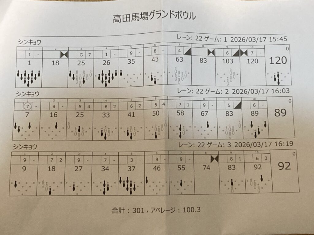 ひどい…。これこそじじいのスコアです…、いや隣のレーンのじじいの方がはるかにうまかった。扇子より重いものを持たないと決めてるので仕方ないです。